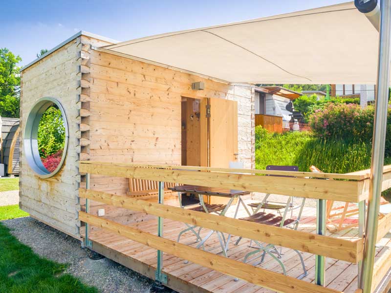 Deux magnifiques ZINIPI Lodges pour 2-3 personnes trônent au-dessus du lac de Constance, sur le Camping Hüttenberg à Eschenz. La vue sur le lac peut être appréciée à travers la fenêtre du hublot.