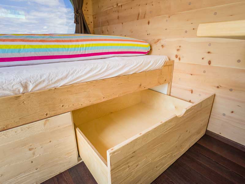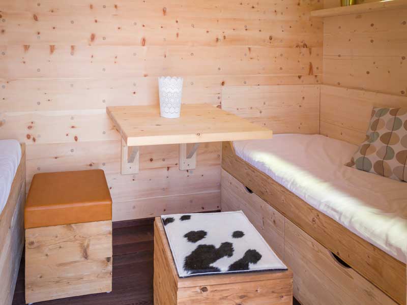 L’aménagement intérieur est en partie en pin cembro. Lit spacieux devant la vue panoramique, concept d’éclairage agréable et lampes de lecture cachées, autre lit simple et armoire. Patères sculptées à la main avec des motifs d’animaux.